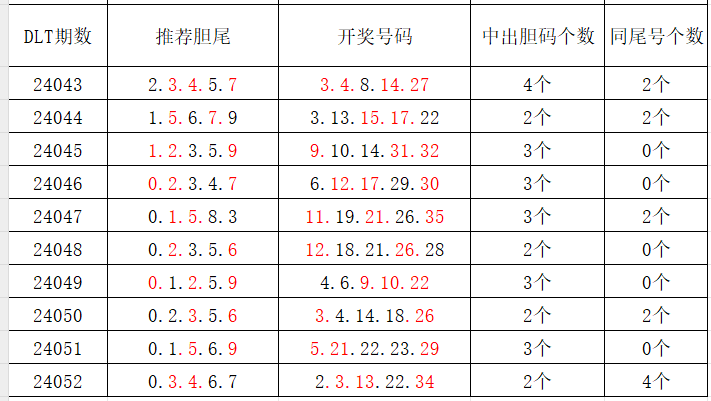 分享第三个数据分析:依据推荐的胆尾,推定胆码号码。每期计算出5个胆尾,做为推荐胆尾。特别注意:推荐胆尾是按照公式计算的顺序,不定位红球号码的顺序。以近10期推荐胆尾的统计数据为例: