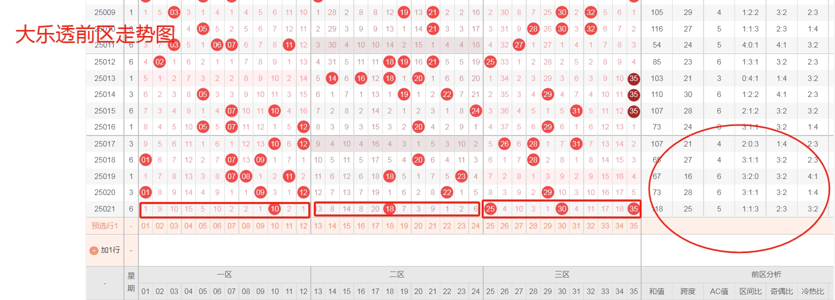 从区间走势图看到前区三个区间比为1:1:3;奇偶比为2:3;大小比4:1;012路比为2:2:1;从前区走势图看趋势一区近期降温态势,判断下期延续概率较大;二区出现回暖形态;三区从近期落号形态看有回暖态势,注意一、二区号码落位回补,判断三区仍将延续这种偏冷态走势;由此主看区间比2:2:1,防2:2:2;奇偶比近10期数值比对,偶数与奇数交替持平,奇数回补态势明显,需要关注偶数反扑;因此判断下期奇数的回补态势较大,主看奇数,奇偶比值3:2,防4:1;从大小个数近期数值比对,下期主看小数号码回补,大小比值2:3;012路在这次开奖号码个数比是2:2:1,从近期数值比对,0路号码回温,1路近期偏温,2路号码回冷,下期判断012路比主看2:2:1;从趋势方面也不排除翻转,注意防守;