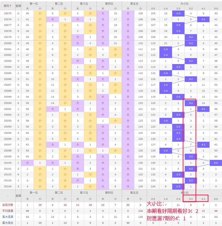 上期大小比:2:3,近10期大小比出现情况:2:3、2:3、4:1、1:4、3:2、5:0、3:2、2:3、3:2、2:3、,最近10期出现3期3:2,出现4期2:3,出现1期4:1,出现1期1:4,出现1期5:0,出现0期0:5,根据近10期规律本期看好隔期开出3:2,防遗漏7期的4:1,综上所述推荐大小比推荐:4:1,重点关注:3:2。