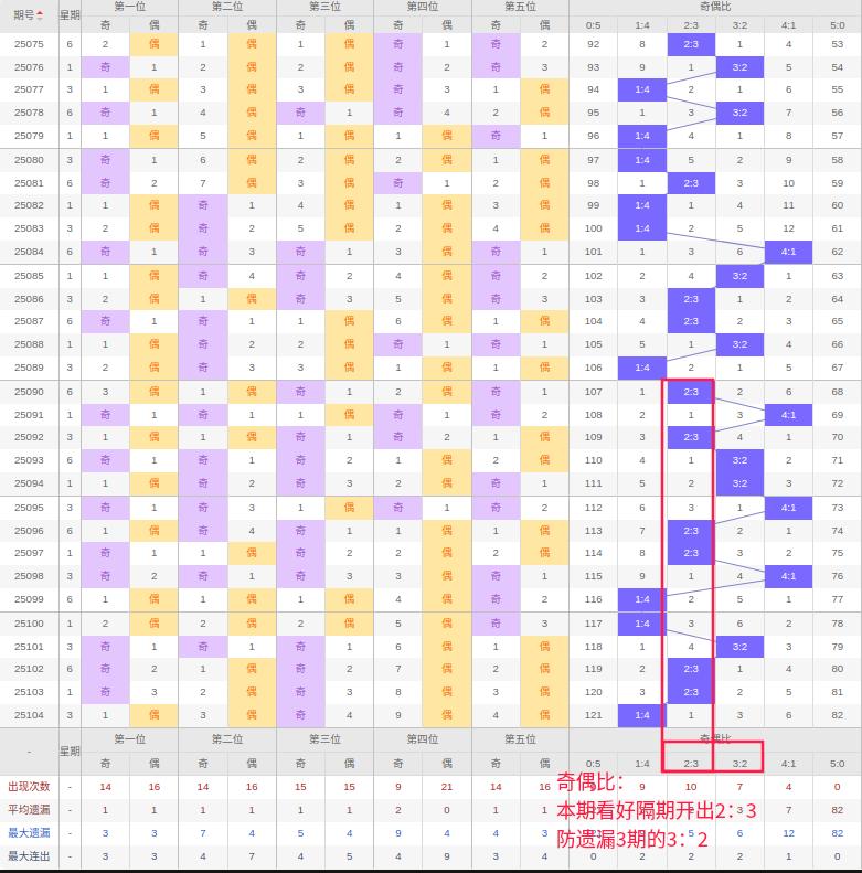 上期奇偶比:1:4,近10期奇偶比出现情况:3:2、4:1、2:3、2:3、4:1、1:4、1:4、3:2、2:3、2:3、1:4,最近10期出现1期3:2,出现4期2:3,出现2期4:1,出现3期1:4,出现0期5:0,出现0期0:5,根据近10期规律本期看好隔期出2:3,防遗漏3期的3:2,综上所述推荐奇偶比推荐:3:2,重点关注:2:3。