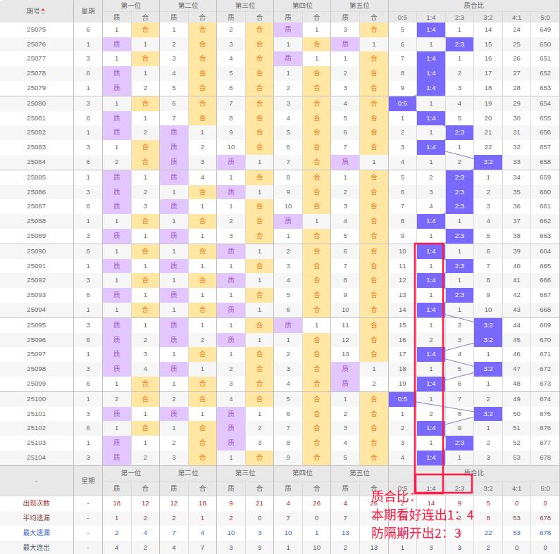 上期质合比:1:4,近10期质合比出现情况:3:2、3:2、1:4、3:2、1:4、0:5、3:2、1:4、2:3、1:4,最近10期出现4期3:2,出现1期2:3,出现0期4:1,出现4期1:4,出现0期5:0,出现1期0:5,根据近10期规律本期看好连出1:4,防隔期开出2:3,综上所述推荐质合比推荐:2:3,重点关注:1:4。