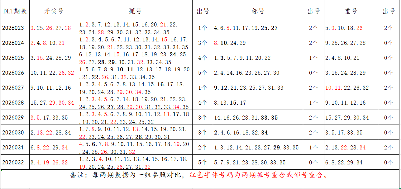 如图,以近两期数据为一组,进行对比分析,相同的孤号、邻号可能在下期开出。本期参考孤号:1.6.7.8.9.10.11.12.13.14.15.16.17.21.22.23.24.28.29.30.34.35;邻号:2.5.18.20.25.27.31.33。重点关注:孤邻号重合号码:***(会员专区可见)。个人分析,仅供参考。