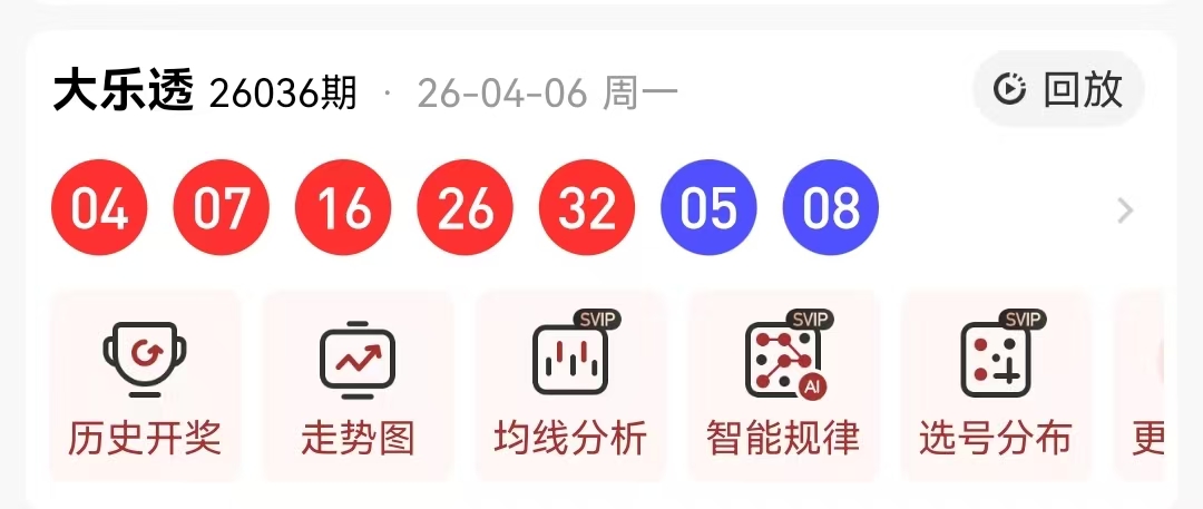 上期大乐透前区奖号开出04 07 16 26 32+05 08。前区的奇偶比为1:4,大小比为2:3,012路比为0:3:2,三区比为2:1:2,和值为85,跨度为28。后区则为一小一大号的组合,这些数据为我们接下来的分析提供了基础。
