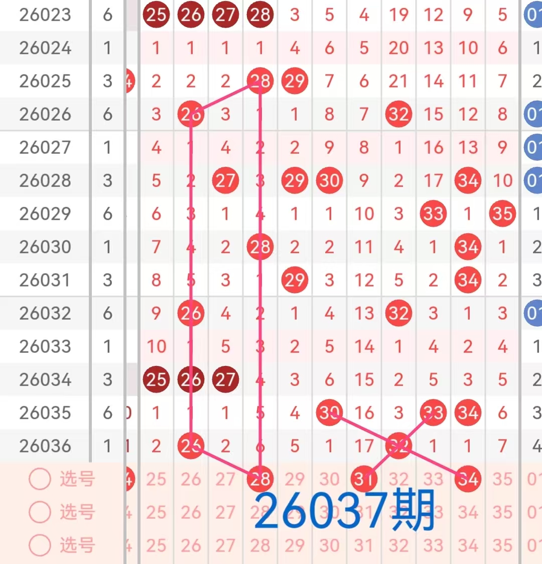 3. 三区(25-35):上期该区间开出来那个个号码26和32。号码26遗漏1期后开出,号码32为该期的凤尾号码,在遗漏3期后开出,且与上期开出的号码33形成斜连走势。由于上期开出的凤尾号码偏大,本期号码会由此减小,凤尾号码预计会在本区间出现,重点关注号码31、34。但是观察历史开奖来看,该区间近期出号较少,因此本期考虑仍然会有1-2个号码继续开出,特别是那些近期表现较热的号码,如号码28本期有望继续开出,因此它们有可能成为本期的出号热点。