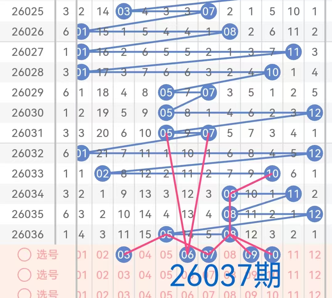 后区号码范围为01-12,分为两个区间:小号(01-06)和大号(07-12)。上期开奖号码为05和08,为一小一大号的组合。