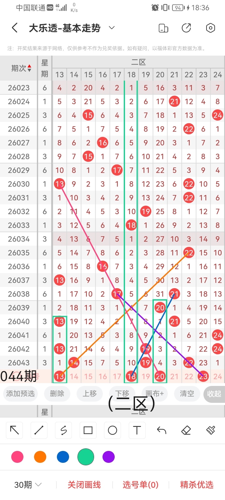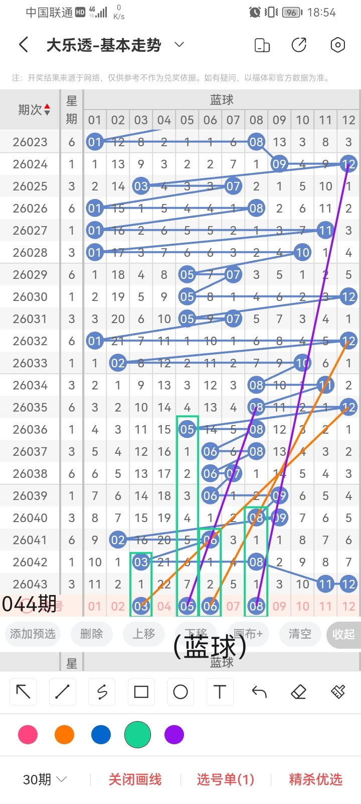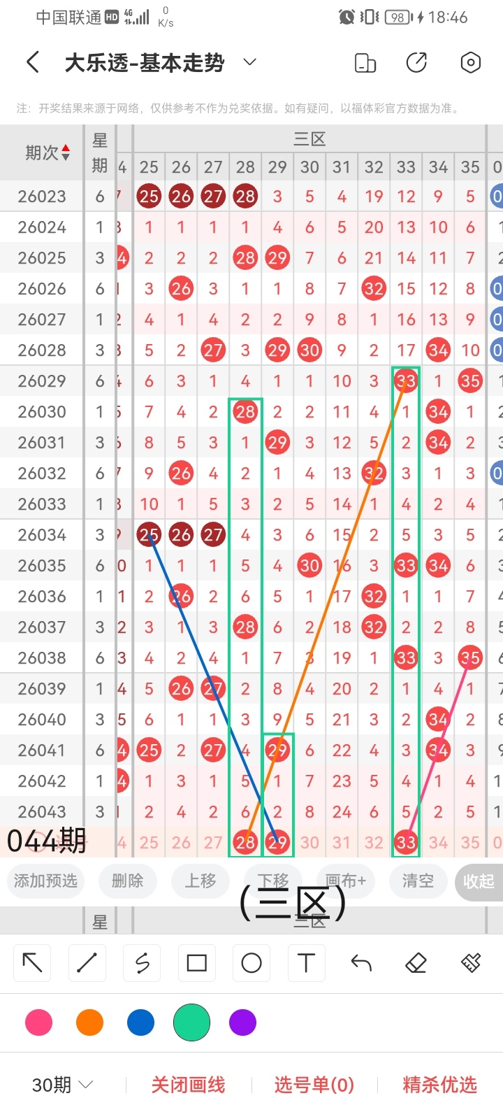 通过以上对上期的简单回顾,下面进入大乐透第2026044期(下面简称本期)的选号分析: