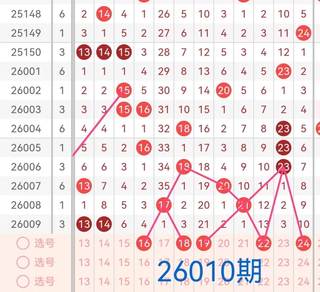 2. 二区(13-24):上期该区间开出两个号码13和14,号码13在遗漏1期后开出。号码14遗漏8期后开出,且与第一区间开出的号码12形成三连号的形式。根据历史开奖来看,近期该区间活跃度较低,本期预计会有1-2个号码会继续开出。特别是那些遗漏次数较大的号码19、22、24和该区间内近期表现较好的号码16、18这个号码在走势上表现出一定的稳定性,且与前几期出号形成呼应,有望出现在本期开奖中。