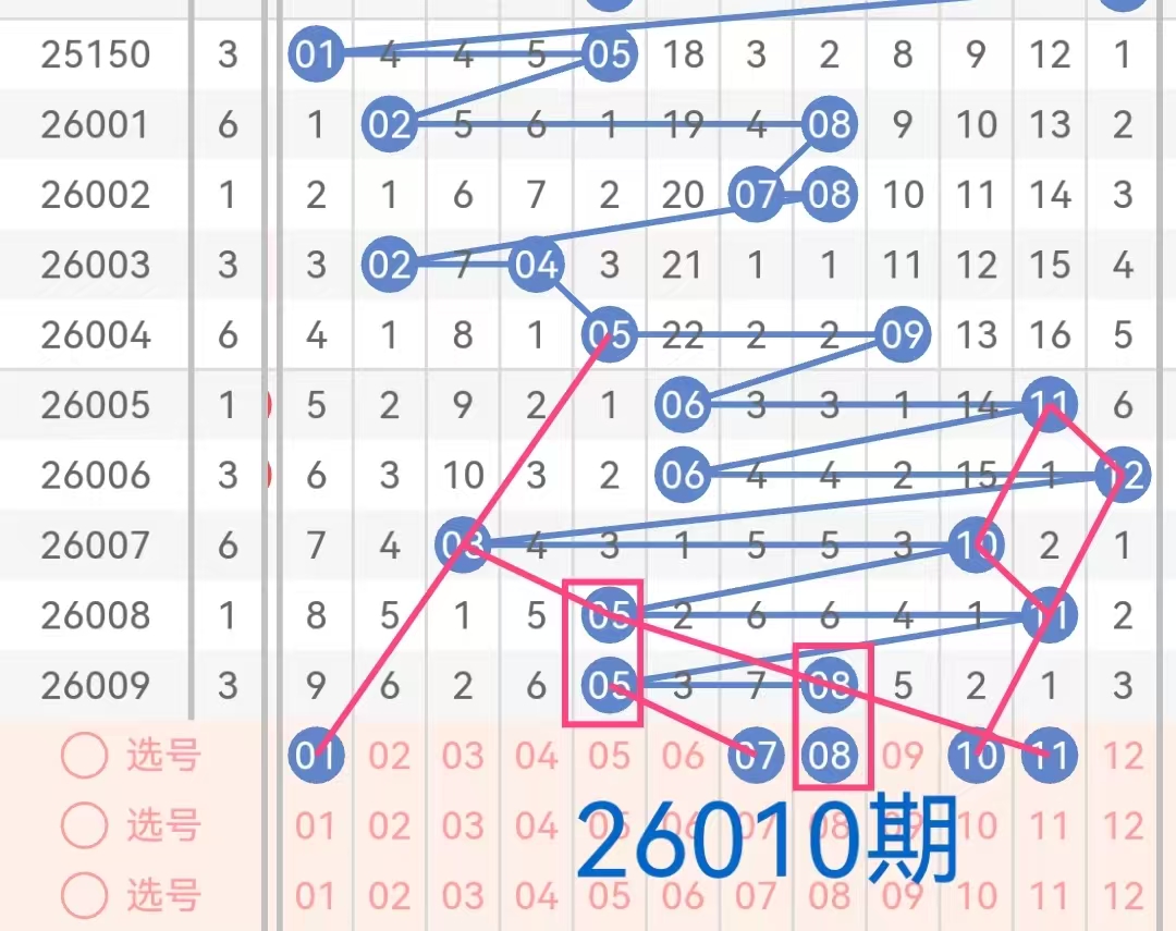 后区号码范围为01-12,分为两个区间:小号(01-06)和大号(07-12)。上期开奖号码为05和08,为一大一小的组合。
