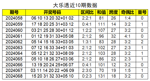 在上一期(2024068期)的开奖中,我们可以看到以下特点: