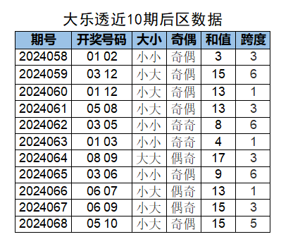 后区上期开出05、10,和值为15,跨度值为5,小大、奇偶组合形态。