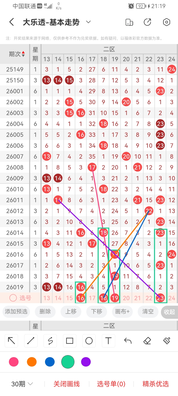 小梁结合上图中画线的思路走位分析,最后给大家汇总一下大乐透本期红球、蓝球数据,供大家参考: