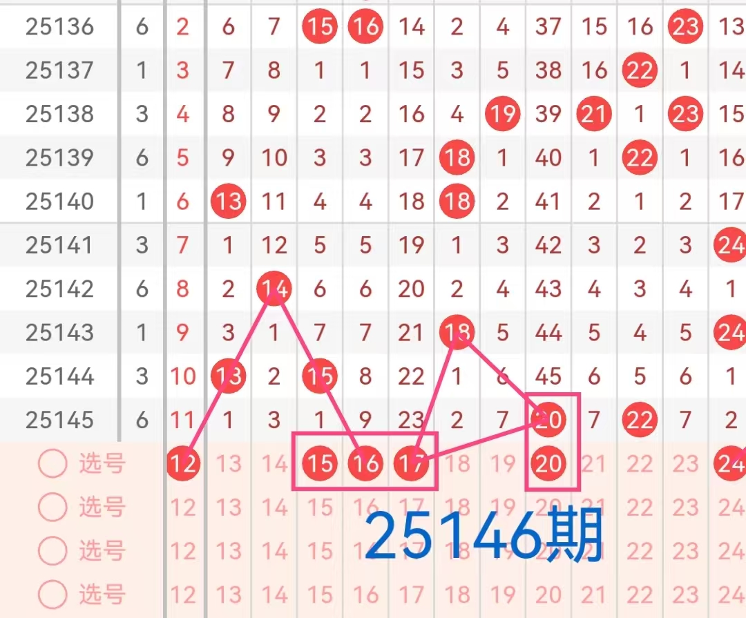 2. 二区(13-24):上期该区间开出两个号码20和22,号码20遗漏45期后开出,号码22相隔5期后再次开出。根据历史开奖来看,近期该区间活跃度较低,本期预计会有1-2个号码会继续开出。特别是那些遗漏次数较大的号码17、20和该区间内近期表现较好的号码15、16、24这个号码在走势上表现出一定的稳定性,且与前几期出号形成呼应,有望出现在本期开奖中。