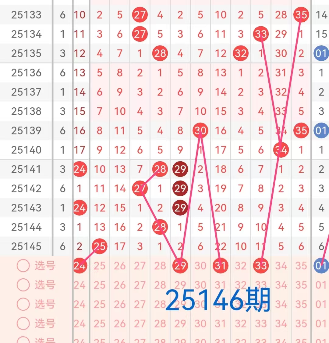 3. 三区(25-35):上期该区间开出一个号码25。号码25为该期的凤尾号码在遗漏13期后开出。由于上期开出的凤尾号码相对中等,本期预计号码会由此增大,重点关注号码29、31、33。但是观察历史开奖来看,该区间近期出号较少,因此本期考虑仍然会有1-2个号码回补开出,特别是那些近期表现较热的号码,如号码29、31、33本期有望回补开出,因此它们有可能成为本期的出号热点。