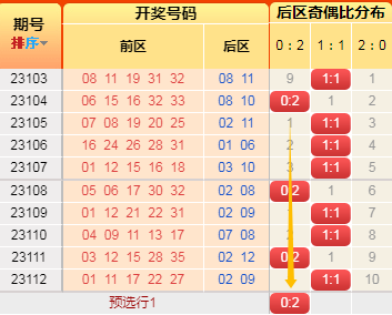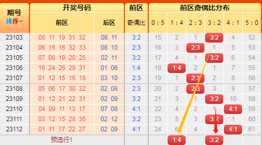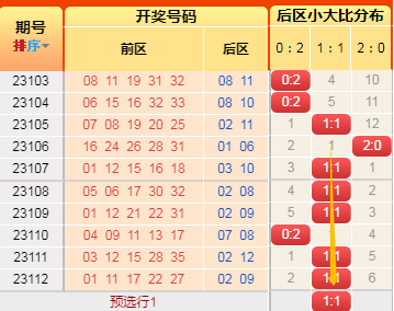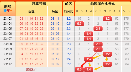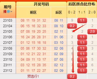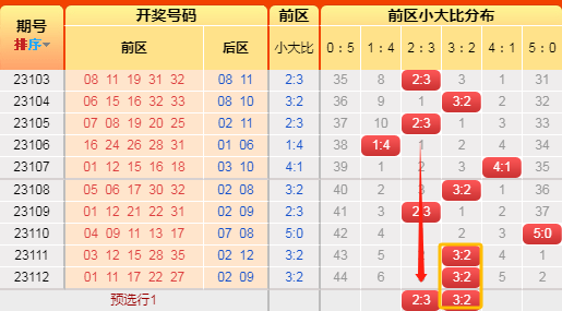 上期前区小大比3:2,连坐了。言归正传我们继续用历史数据说话,前区小大比分成6种0:5、1:4、2:3、3:2、4:1、5:0(如图),我统计了一下历史出现次数,0:5出现99次、1:4出现449次、2:3出现884次、3:2出现702次、4:1出现298次,5:0出现44次,再看近10期小大比出现次数比为0:1:3:4:1:1,通过数据观察,上期冷值5:0开出,一片哗然,4:1开过短期内否定掉,剩下1:4、2:3、3:2还是低于历史比值,根据遗漏对称理论原则,故本期咱们选2:3或3:2;(如想进一步了解,请直接上车或周六17点来直播间看直播)