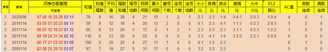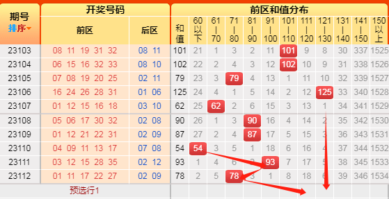 上期开出和值78,再次命中该和值属性。本次我们先根据历史次数统计,和值60以下开出207次、61-70开出205次、71-80开出316次,81-90开出420次、91-100开出454次,101-110开出333次、111-120开出275次、121-130开出146次、131-140开出82次、141-150开出26次、150以上开出8次,再来看近十次以上和值分别开出了1次、1次、2次、2次、1次、2次、0次、1次、0次、0次、0次 ,低于阈值的有71-80区间、91-100区间、101-110区域、111-120区域、131-140区域,再根据遗漏斜率对称理论,所以我选择111-120区间或121-130区间。
