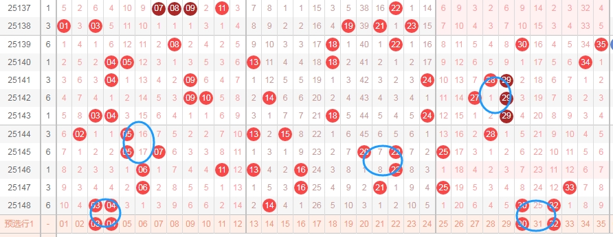 上图是体彩大乐透前区开奖号码分布走势图,我在上面走势图中标注的蓝色圈圈表示的最近前区号码的特点,可以发现上期出现了30 32上面出现了20 22后一期22就重复了,还有最上面的27 29后一期就重复了29,那么本期可以关注30 32重复其中一个。同理上期出现了03 04本期个人觉得也可以关注其中一个数字重复。