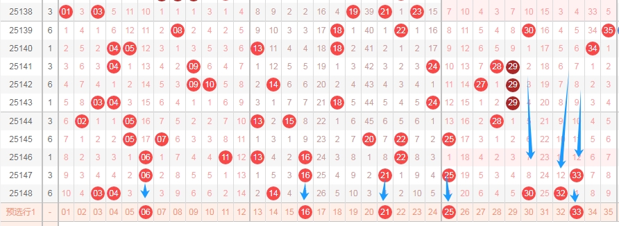 上图是体彩大乐透前区开奖号码分布走势图,我在上面走势图中标注的蓝色箭头表示的最近前区开奖号码的遗漏周期可以发现上期数字30遗漏周期是8期,数字32遗漏周期是12期,那么本期应该关注遗漏周期小的数字,因为上期出现的都是遗漏周期大的数字,所以我在上面走势图中标注的数字06 16 21 25 33应该关注出1个或者2个。