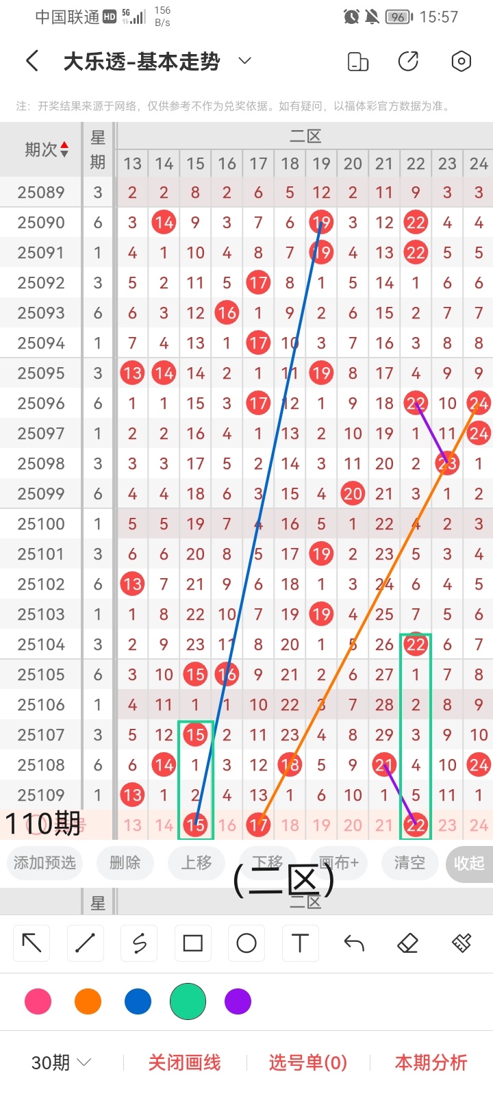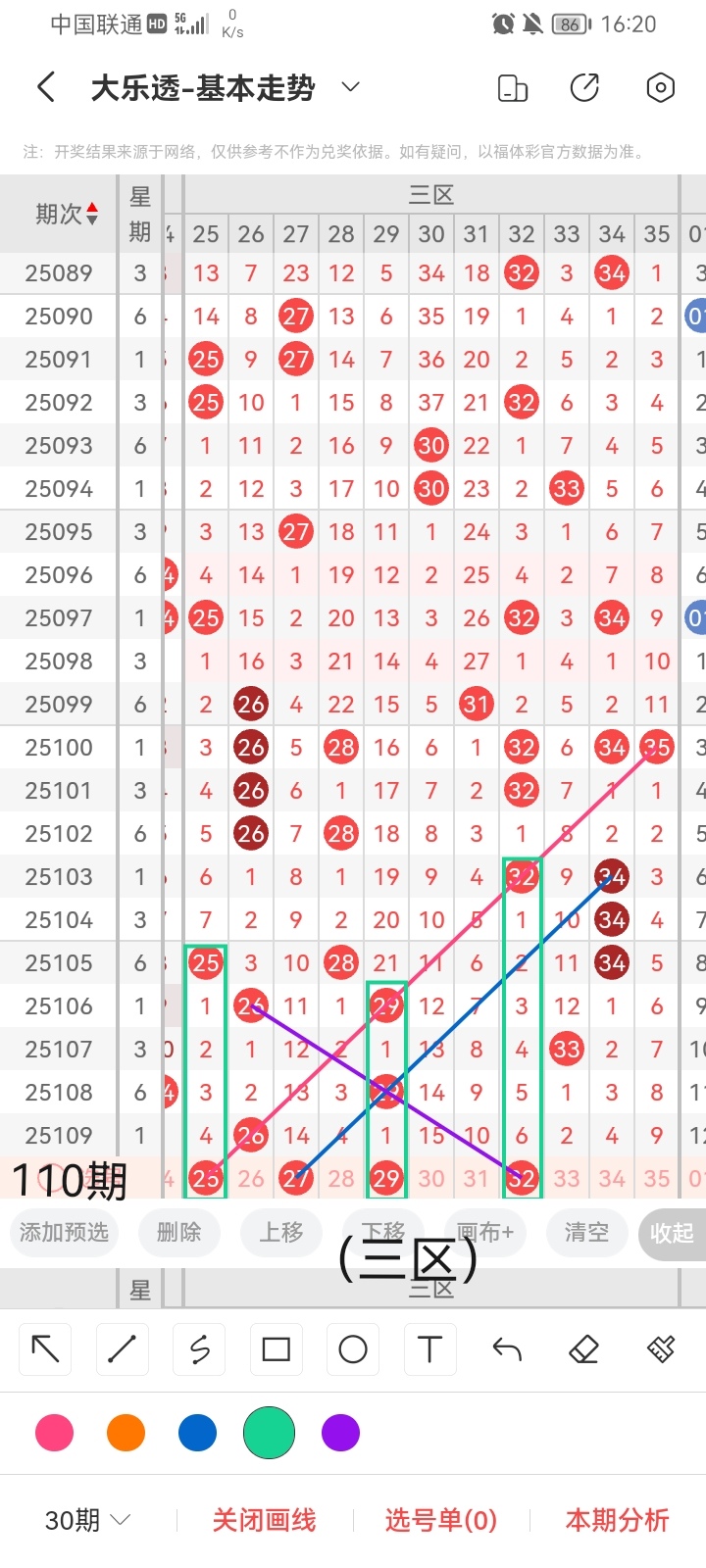 小梁根据图中画线思路,最后给大家汇总提供一下大乐透本期红球、蓝球数据,供大家参考: