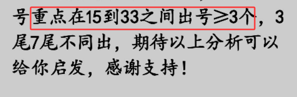 龙头凤尾:上期文章提醒大家防守龙头继续二路,果然龙头开出二路号,那么本期是不是很大概率继续二路号龙头呢,我认为是有可能的,那么考虑2.5.11这几个,那么只要判断好单数双数,就剩下两码了,近期的5比较热,可以重点关注下,凤尾上期专属给大家分析29是凤尾是非常精彩的,本期注意跟随号33,如果不喜欢可以考虑27,或者29.30.35这几个,上期的冷号一码按死21,完全正确,特别讲解了24的出号逻辑也是完全正确,这个18就是乾坤大挪移的出号需求,专属常常给大家讲解,杀号十一码错杀了14,的确没想到冷号开出四码,但是给大家的跨度三跨稳稳当当,还有四跨也出了,包括有大跨度大于10,以及看15到33出号大于等于三个也是正确的。