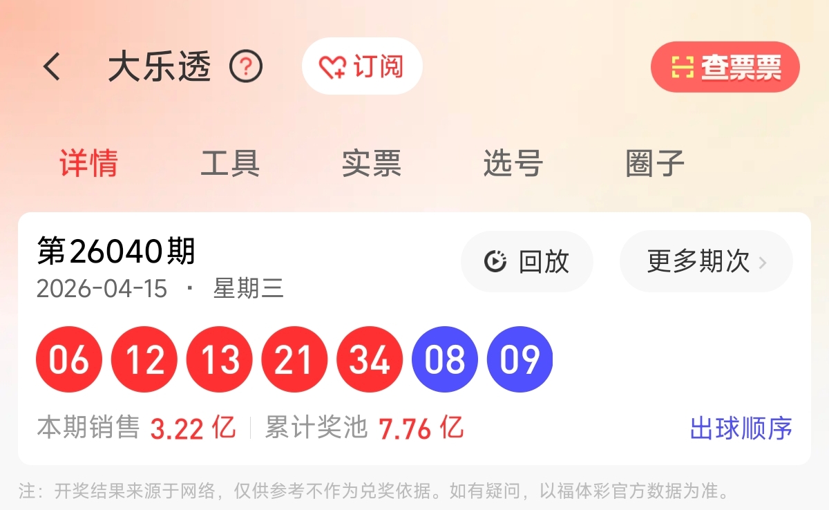 首先让我们回顾一下上期大乐透26040期的开奖为06、12、13、21、34,蓝球08、09 。前区和值86,前区跨28,区间比为2:2:1,奇偶比为2:3。