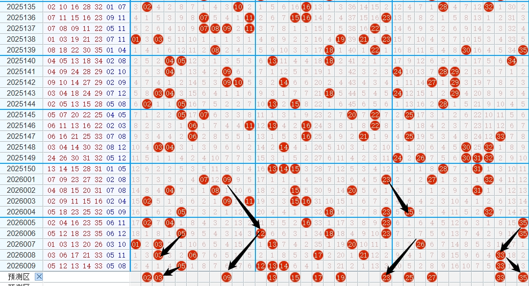 回顾上期26008期开奖05 12 13 14 33+ 05 08,其中一小区01-12出1个,二小区13-24出3个号,三小区25-35出1个!