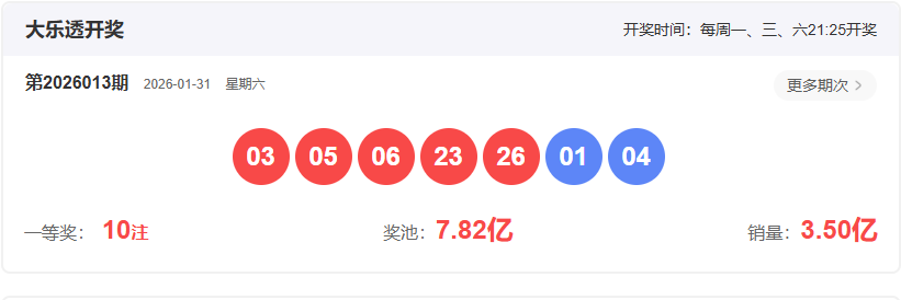 开奖号码:03 05 06 23 26- 01 04