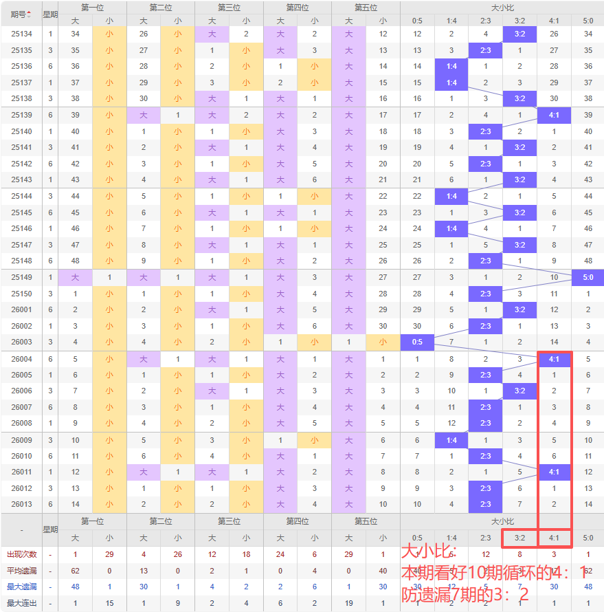 上期大小比:2:3,近10期大小比出现情况:4:1、2:3、3:2、2:3、2:3、1:4、2:3、4:1、2:3、2:3,最近10期出现1期3:2,出现6期2:3,出现2期4:1,出现1期1:4,出现0期5:0,出现0期0:5,根据近10期规律本期看好10期循环开4:1,防遗漏7期的3:2,综上所述推荐大小比推荐:3:2,重点关注:4:1。