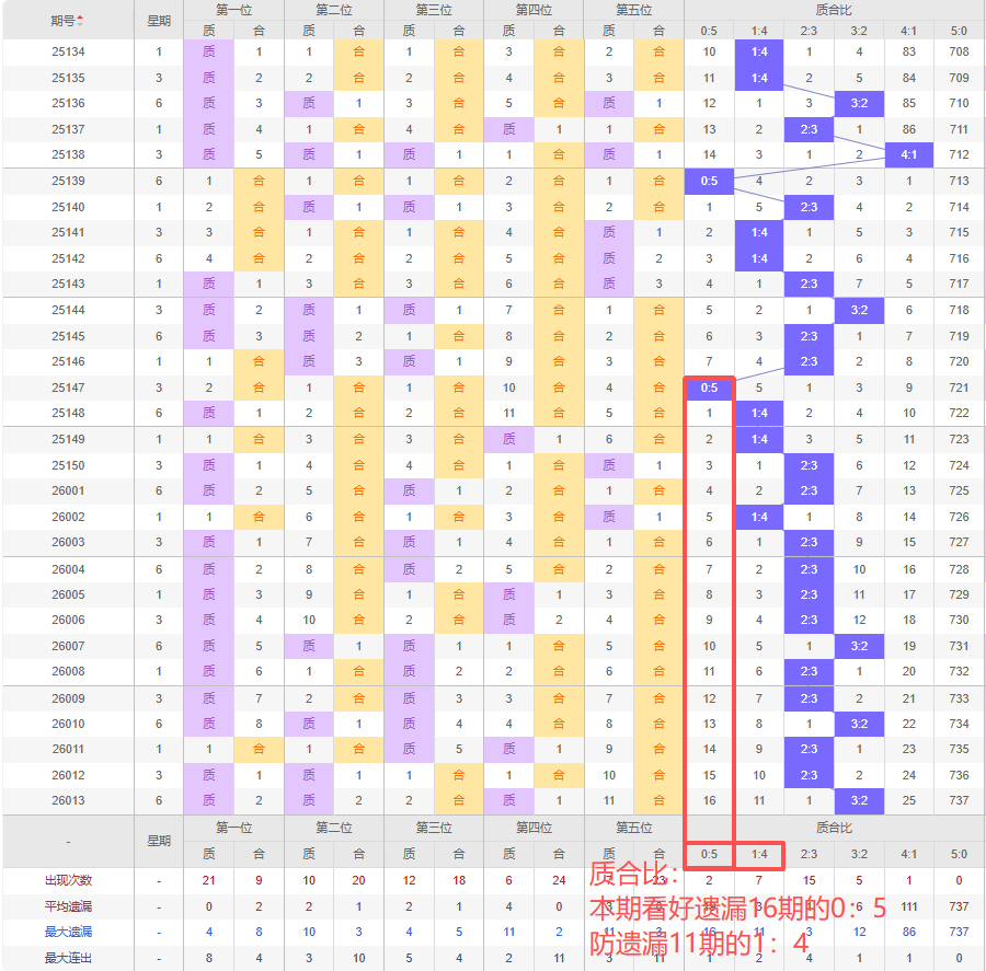上期质合比:3:2,近10期质合比出现情况:2:3、2:3、2:3、3:2、2:3、2:3、3:2、2:3、2:3、3:2,最近10期出现3期3:2,出现7期2:3,出现0期4:1,出现10期1:4,出现0期5:0,出现0期0:5,根据近10期规律本期看好遗漏16期的0:5,防遗漏11期的1:4,综上所述推荐质合比推荐:1:4,重点关注:0:5。