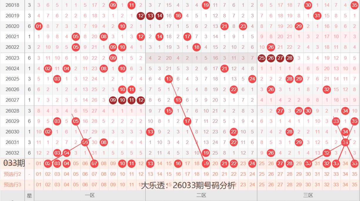 通过上期号码的简单分析,我们看下26033期红色号码球的总体走势,如下图: