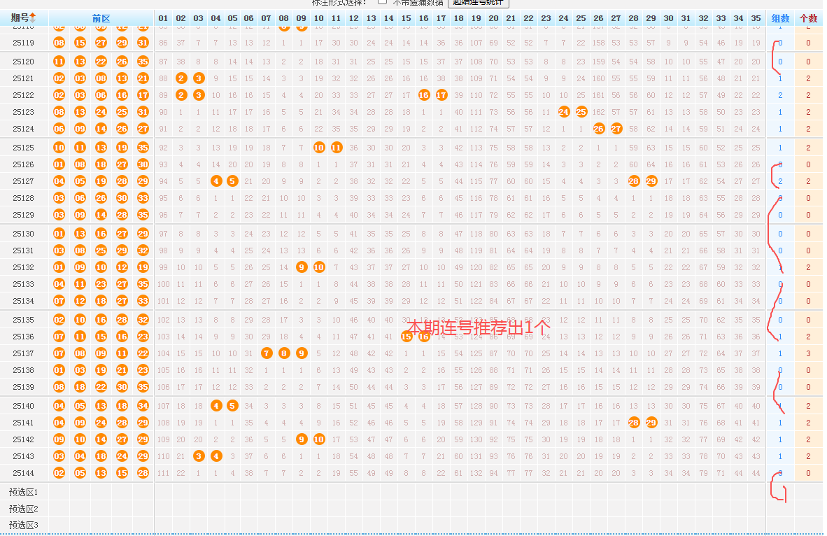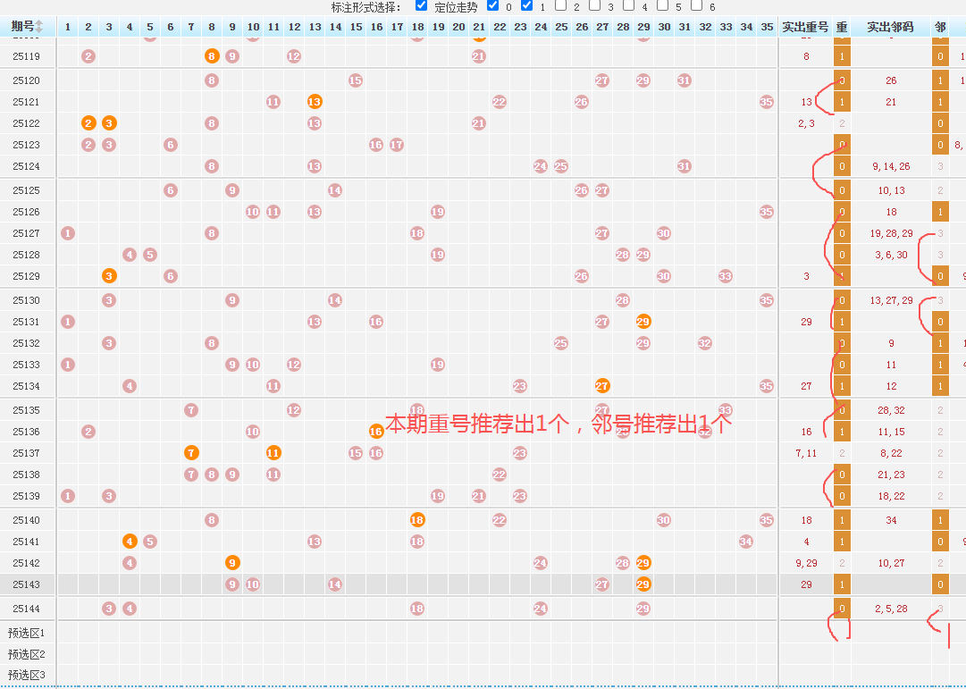 2、本期分析第二步就是断分区,按照走势及历史数据分析本期断4分区概率较大,就是断22-28之间的号,大家看好可用。