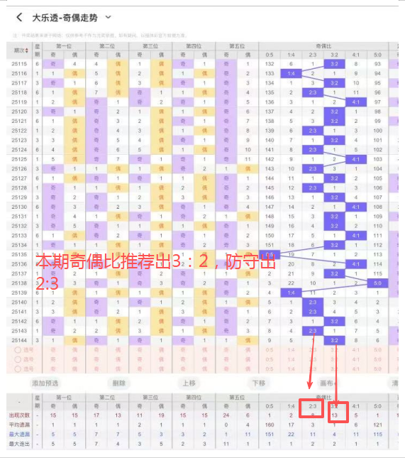 4、奇偶比:上期开出3个奇数,出2个偶数,奇偶比3:2,整体看偶数强势,本期关注偶数回补,本期推荐出3:2,防守出2:3 。