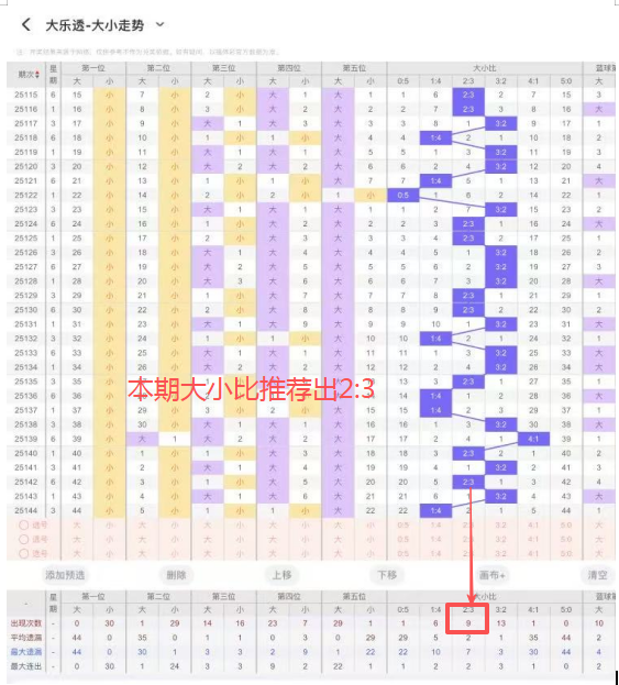 前区奖号开出0个重号,连号开出3个,奇偶比为3:2,和值为63,跨度为26,三个区间比为2:2:1,后区开出0个重号,出2个大号。