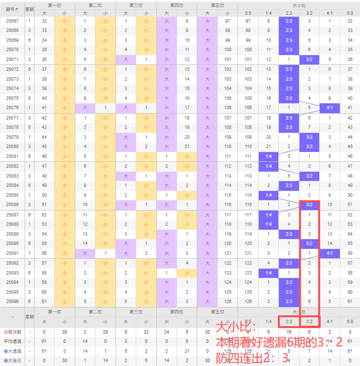 上期大小比:2:3,近10期大小比出现情况:1:4、1:4、2:3、3:2、4:1、2:3、1:4、2:3、2:3、2:3,最近10期出现1期3:2,出现5期2:3,出现1期4:1,出现3期1:4,出现0期5:0,出现0期0:5,根据近10期规律本期看好遗漏7期的1:4,防连出2:3,综上所述推荐大小比推荐:2:3,重点关注:1:4。