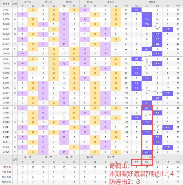 上期奇偶比:2:3,近10期奇偶比出现情况:2:3、3:2、1:4、2:3、4:1、2:3、3:2、3:2、4:1、2:3,最近10期出现4期3:2,出现3期2:3,出现2期4:1,出现1期1:4,出现0期5:0,出现0期0:5,根据近10期规律本期看好遗漏7期的1:4,防连出2:3,综上所述推荐奇偶比推荐:2:3,重点关注:1:4。