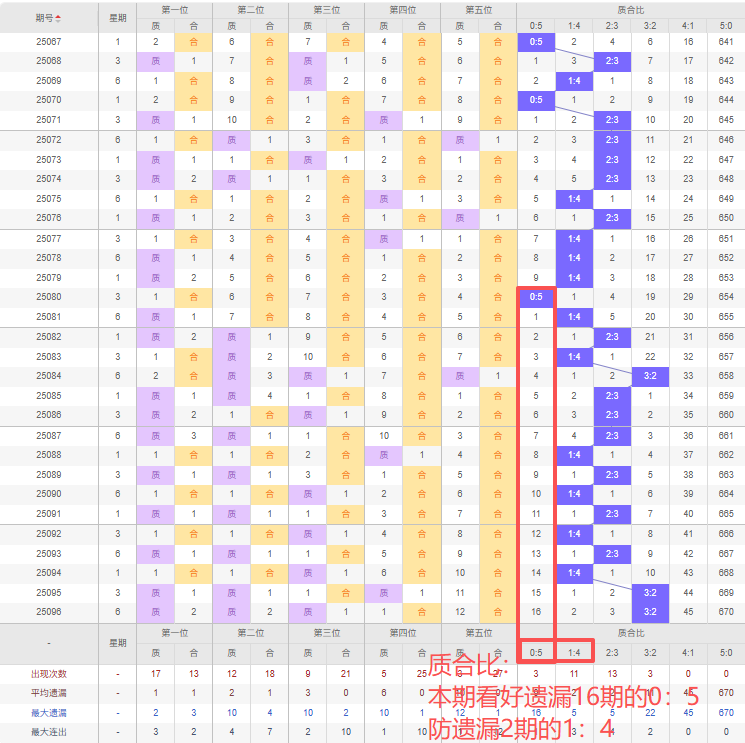 上期质合比:3:2,近10期质合比出现情况:2:3、1:4、2:3、1:4、2:3、1:4、2:3、1:4、3:2、3:2,最近10期出现2期3:2,出现4期2:3,出现0期4:1,出现4期1:4,出现0期5:0,出现0期0:5,根据近10期规律本期看好遗漏16期的0:5,防遗漏2期的1:4,综上所述推荐质合比推荐:1:4,重点关注:0:5。