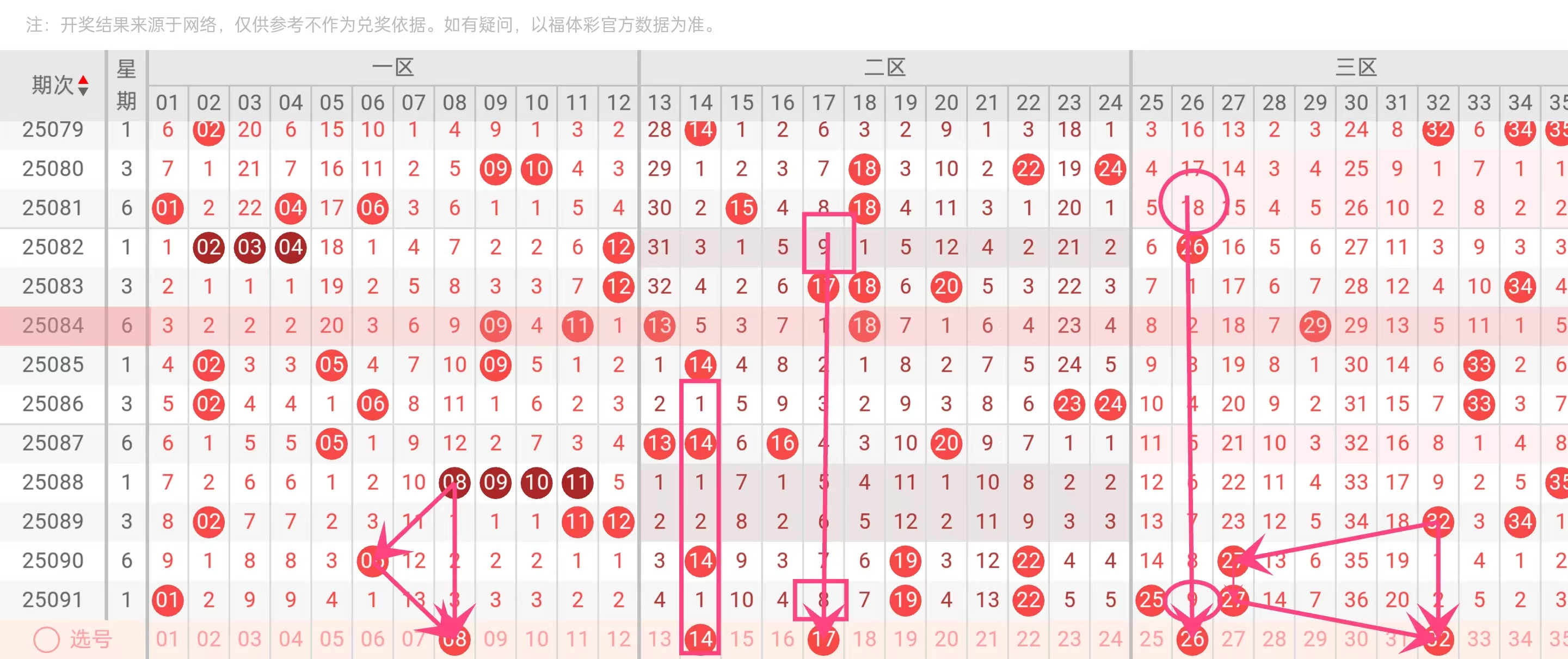 它所在的(08-14)区域也连续6期没有号码出现,形成了“真空”。认为这种极端冷态积蓄了巨大能量,反弹出现的概率超过95%(所谓的“量子补偿效应”)。