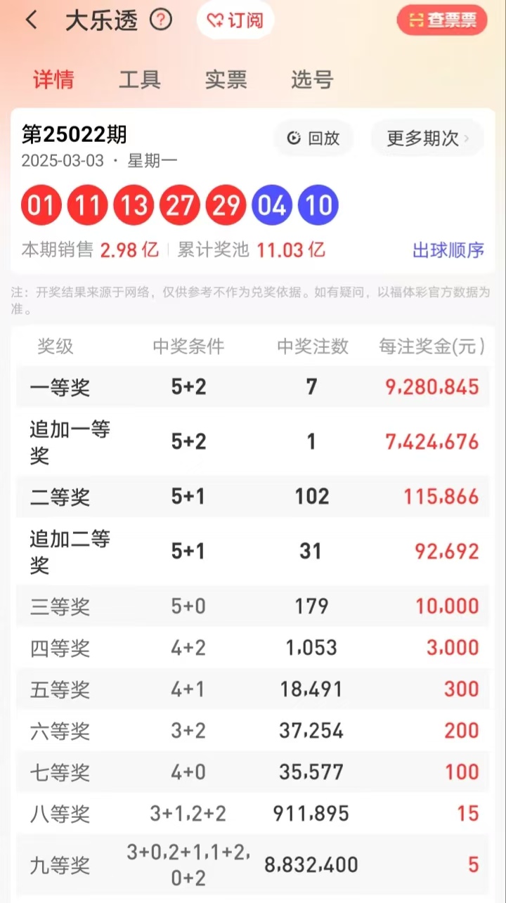 • 策略:覆盖一区热号(02、05、11)、二区奇偶平衡(13、17、19)、三区大跨度(25、32)。