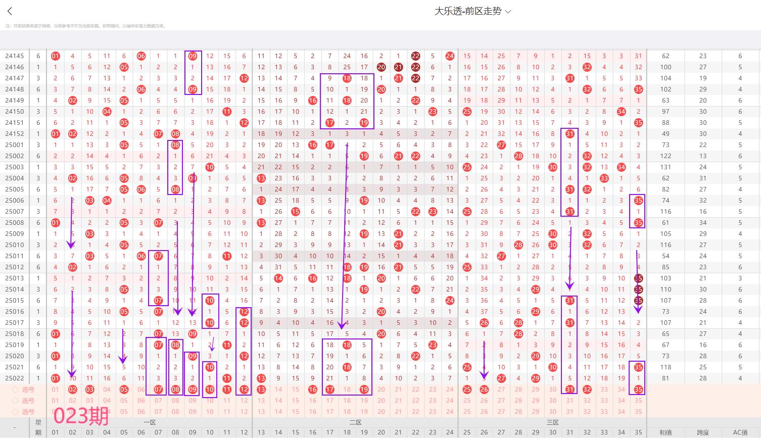 3. 三区(25-35)近期趋势:25-29段热出(如27、29连续2期),30-35段冷态(遗漏≥3期)。跨度关联:三区大跨度号(如32、33)常伴随和值走高,本期需防31、32回补。推荐重点:25、26、31、32为主力,防冷号30突破。