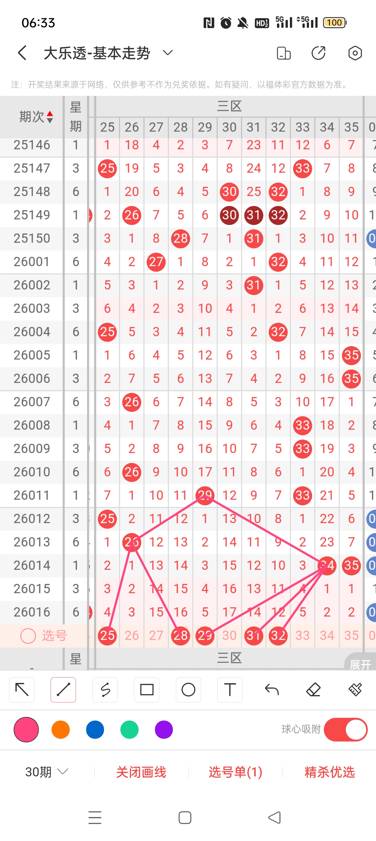 三区(25-35)近20期本区邻孤传3邻17孤0传,孤号热度高,本期着重邻传。近20期本区012路1:3:16,2路热度高,本期着重0/1路。25、28分别遗漏4期、16期,两者依托26呈现正三角遗漏递减态势,需防。29、31、32分别遗漏5期、14期、12期,三者与34之间呈现向左遗漏递减态势,需防。