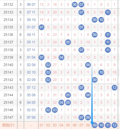上图是体彩大乐透后区开奖号码分布走势图,我在上面图中标注的蓝色箭头,看蓝色箭头右边这几个数字09 10 11 12连续4期没出现号码,那么本期这个区域个人觉得09 10 11 12可以关注出1个或者2个。