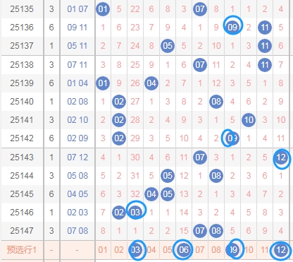 上图是体彩大乐透后区开奖号码分布走势图,我在上面图中标注的蓝色圈圈里面的数字是0路球数字,大乐透后区12个数字可以分为0路球数字03 06 09 12,1路球数字01 04 07 10,2路球数字02 05 08 11。看整个0路球数字可以发现,最近0路球数字出号码不多,本期个人觉得0路球数字03 06 09 12可以关注出1个或者2个。