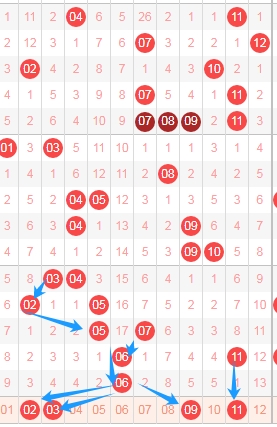 上图是体彩大乐透开奖号码分布走势图第一区域,我在上面图中标注的蓝色箭头是最近开出号码的特点,最近第一个号码的跨度不大,所以本期可以关注02 03,同样关注09 11,本期个人觉得02 03 09 11出1个或者2个。