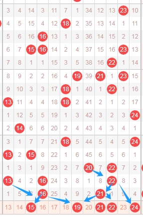 上图是体彩大乐透开奖号码分布走势图第二个区域,我在上面图中标注的蓝色箭头是最近开出号码的特点,本期个人觉得这些数字15 19 21 22 24可以关注出2个或者3个。