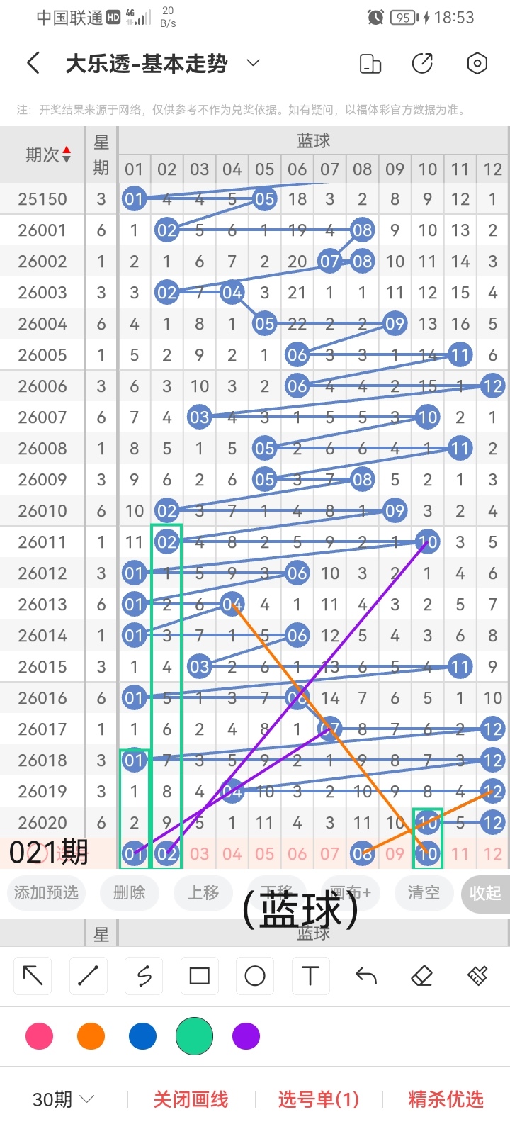 小梁结合上图中画线的思路走位分析,最后给大家汇总一下大乐透本期红球、蓝球数据,供大家参考: