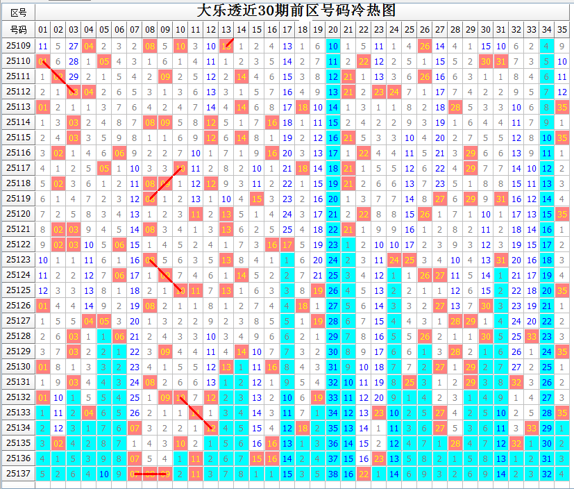 大乐透近30期前区号码冷热图(数字为遗漏期数,蓝色标记的为遗漏超过10期的大冷号)