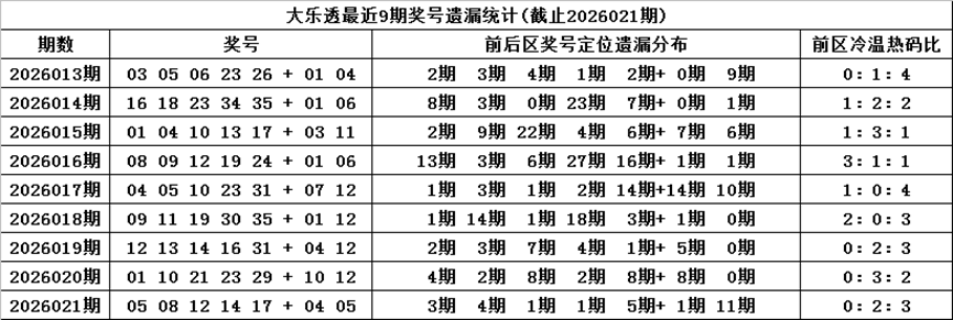 体彩大乐透第2026021期奖号为:05 08 12 14 17 + 04 05,各位号码遗漏期数分别为:3期、4期、1期、1期、5期+1期、11期,前区号码遗漏总期数为14期,012路比为1:0:4,奇偶比为2:3,没有开出重复号码。后区号码遗漏总期数为12期,和值为9,跨度为1。