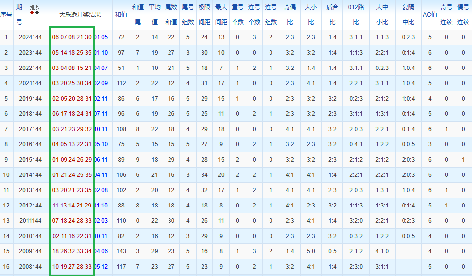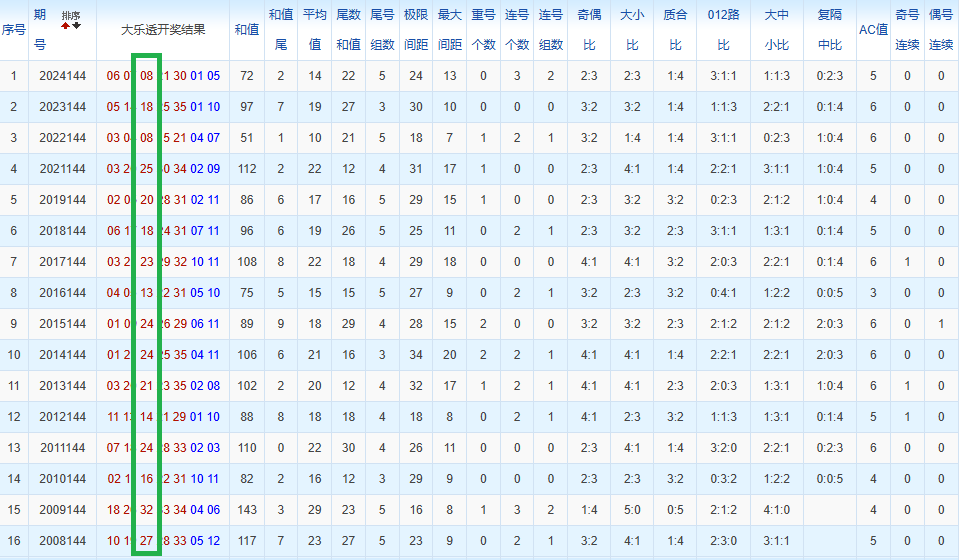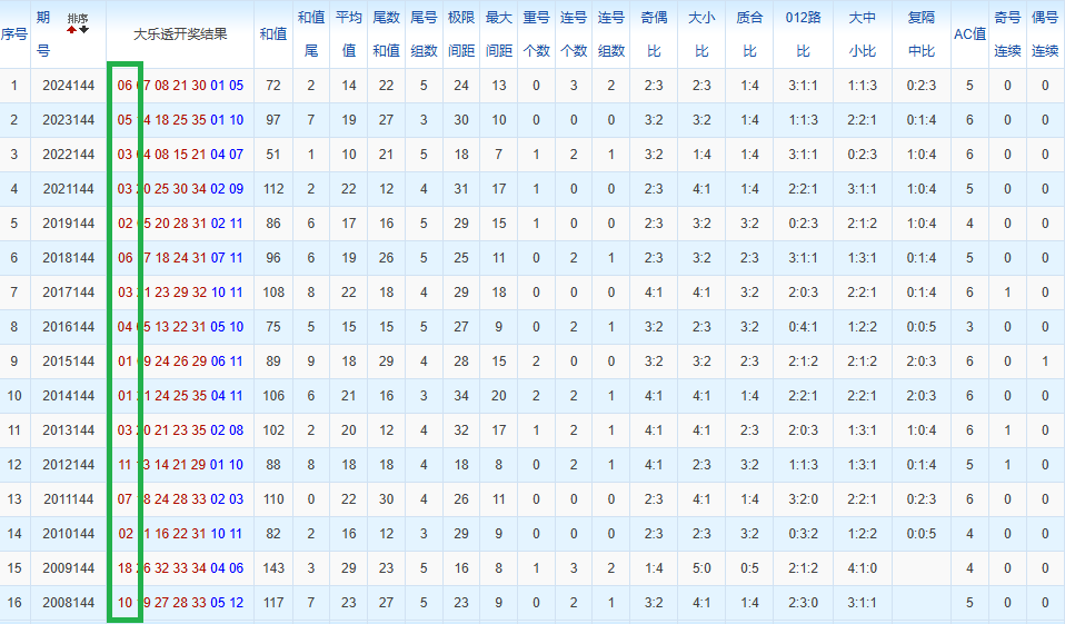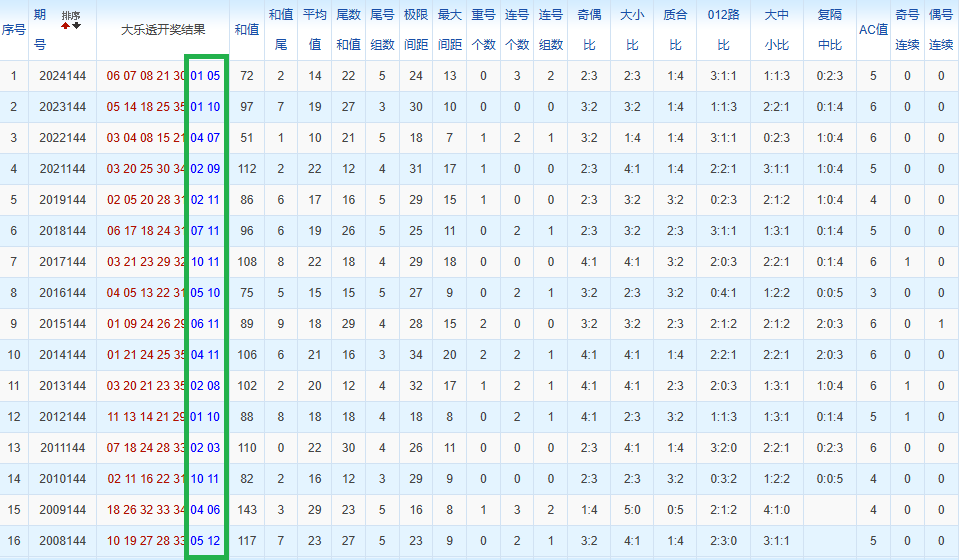 通过观察,我发现往年同期的开奖数据与本期号码之间存在显著关联。具体来说,在前区号码中,从第一位至第五位,通常会有约三个位置上的数字与往年同期相同位置的号码一致;而后区号码中,也有多期开奖结果直接包含了往年同期的数字。因此,我们可以借助往年同期各位置上的号码,作为分析本期开奖情况的重要依据。在此基础上,还可结合往年同期的其他相关条件,进行综合性的号码组合推荐。