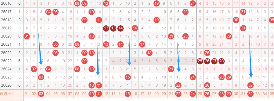 上图是体彩大乐透前区开奖号码走势分布图,我在上面走势图中标注出来的数字都是遗漏周期小的数字,分别是数字03 10 11 15 22 24 26 28 29 32都是重复号码和隔一期的数字都是遗漏周期小的数字,你们看看上面走势图中标注出来的蓝色大箭头都是遗漏周期大的,上期开出数字32遗漏周期是21期,数字11遗漏周期是7期,上面数字03遗漏周期是11期,数字15遗漏周期是21期,上期开出的数字22遗漏周期是13期,那么本期出遗漏周期小的数字的机会是有的,关注遗漏周期小的数字出2个或者3个吧。