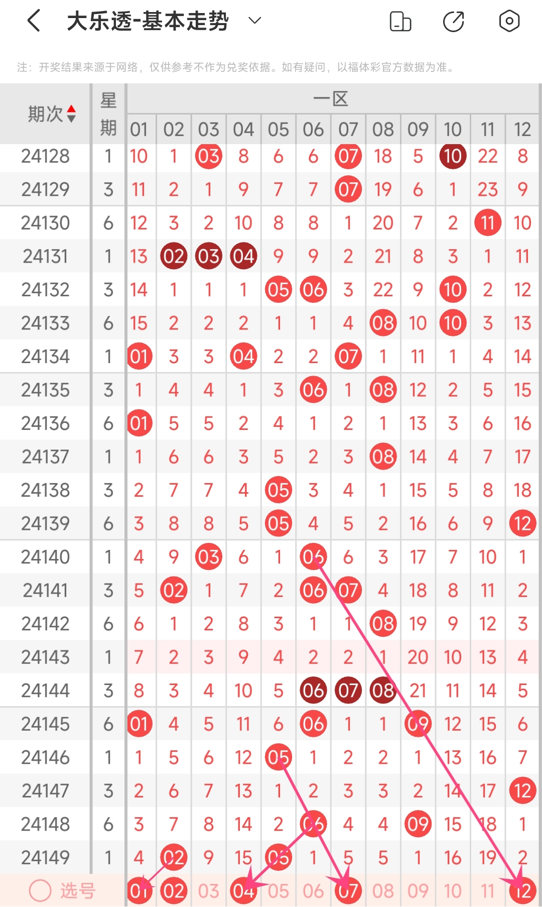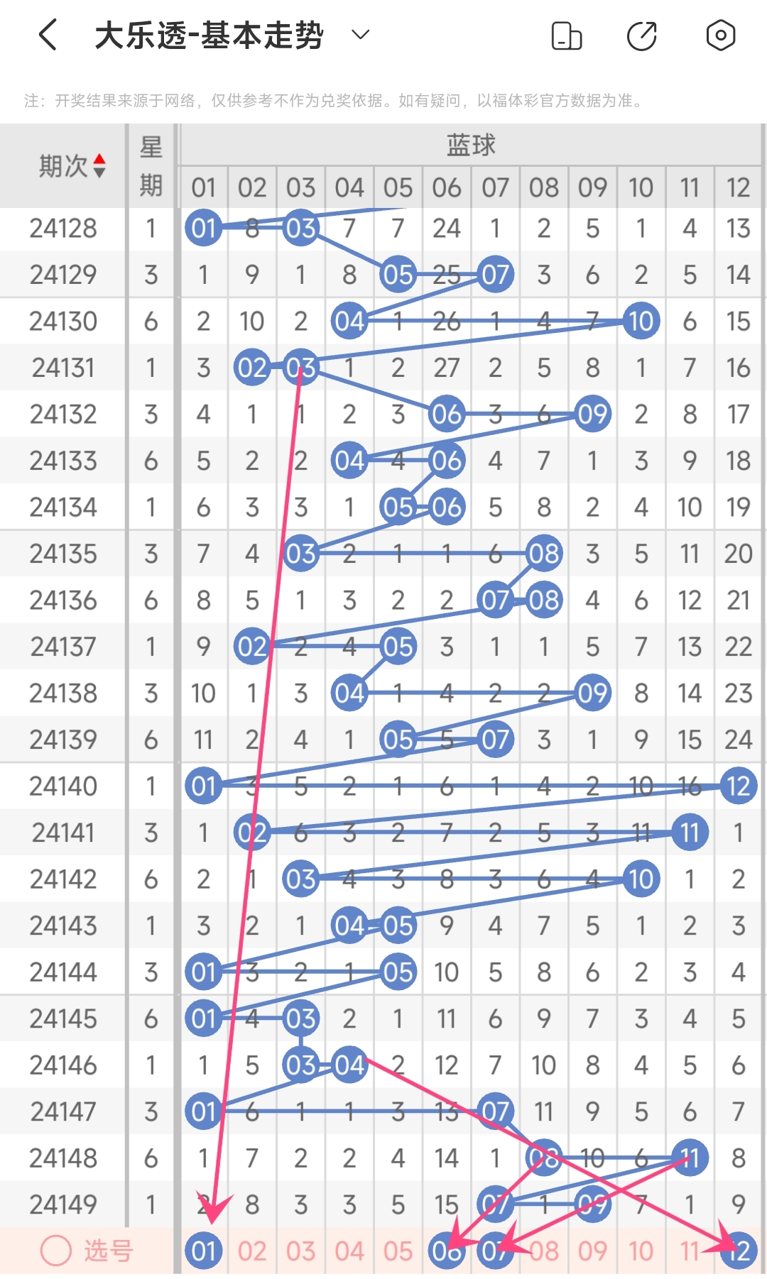 蓝球上期(24149期)开出了07-09,开出了两奇组合出号,本期需要注意是会继续开出奇组合还是会开出一奇一偶或者两偶组合,且在开出一大一小组合出号后开出后端两个大号组合出号,本期需要注意是会继续开出后端大号号码还是会回补前端小号号码,蓝球本期首先需要关注的号码【01】两期回补号码带斜连走势,然后是【06】斜三连走势,其次是【07】重号带斜连走势【12】九期回补号码带斜连走势,蓝球本期重点关注号码【01 06 07 12】