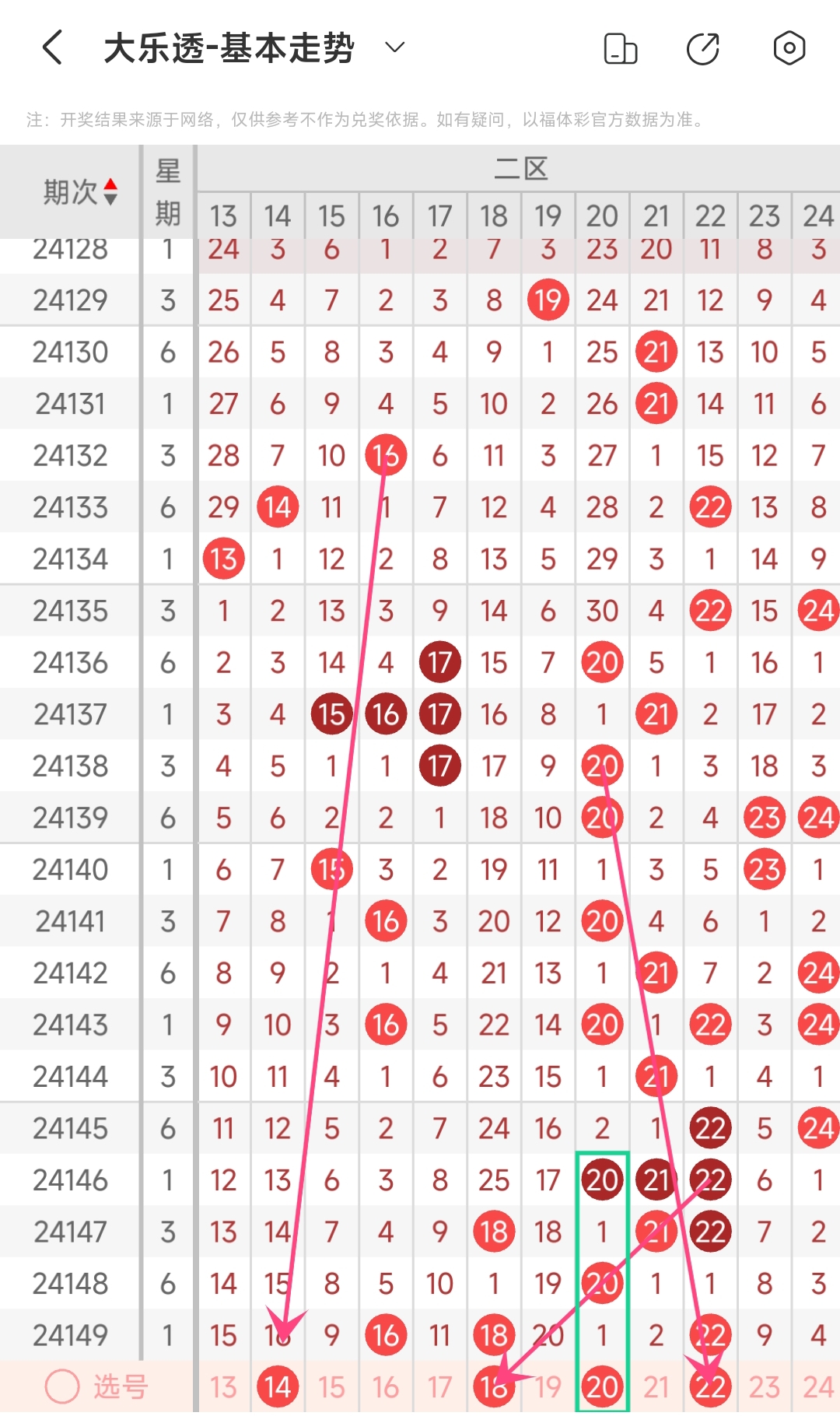 二区间上期(24149期)开出了三码16-18-22,开出了独码,本期做号需要注意斜连走势号码能否开出,以及空白区域号码回补落码,区间由温态开出两码落位后走出了冷态开出了单码落位,本期需要注意是会继续走冷开出单码落位还是会走热开出多码落位,本期首先需要关注的号码【14】遗漏十六期冷号带斜连走势,然后是【18】重号带斜连走势,其次是【20】隔期回补号带对称形态,【22】重号带斜连走势,本期重点关注号码【14 18 20 22】